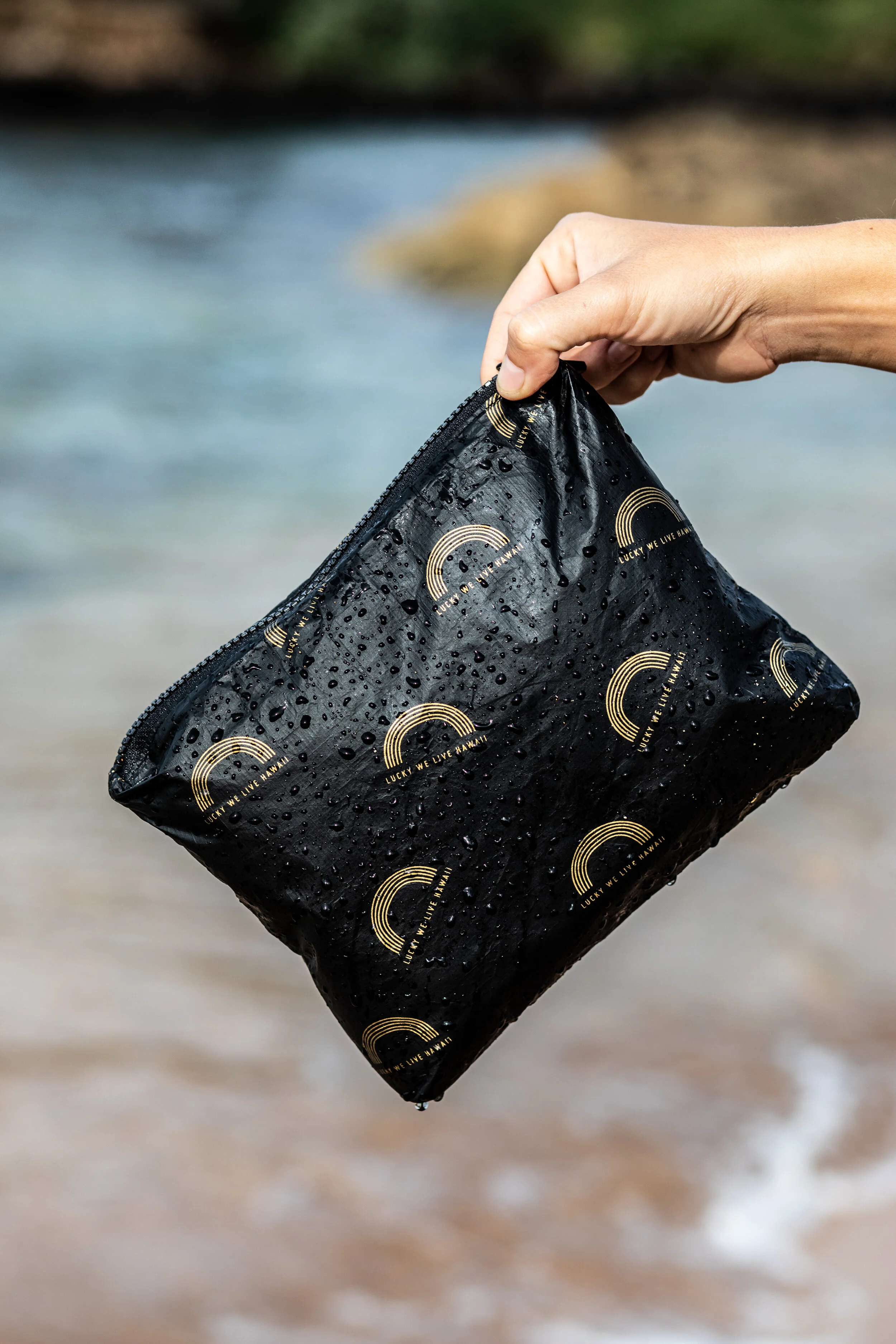 Splash proof, lightweight, and ready for all your travel adventures is our latest collaboration with the Aloha Collection! Featuring the mini and small Aloha pouches with our Lucky We Live Hawaii rainbow logo design. These bags are the perfect everyday essential that can help organize and carry anything from your cosmetics, to your wet and dry goods from the beach to the streets.